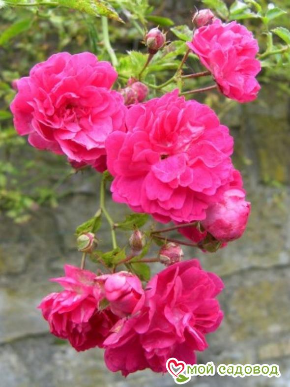 Растение пышно и обильно цветет, после того как раскроются все соцветия, на кустах будет видно мало листьев. На каждой плети одновременно растет 4-10 бутонов. Полностью раскрывшиеся соцветия достигают 3.5-5.5 см диаметре. Бутоны густомахровые в их составе может быть до 85 лепестков.